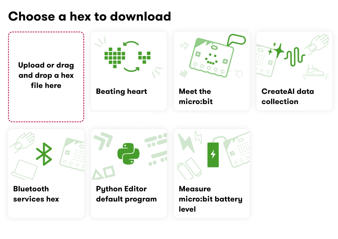 The micro:bit hex download tool page (see below) allows you to select from the most commonly used/requested hex files and also upload your own hex file.